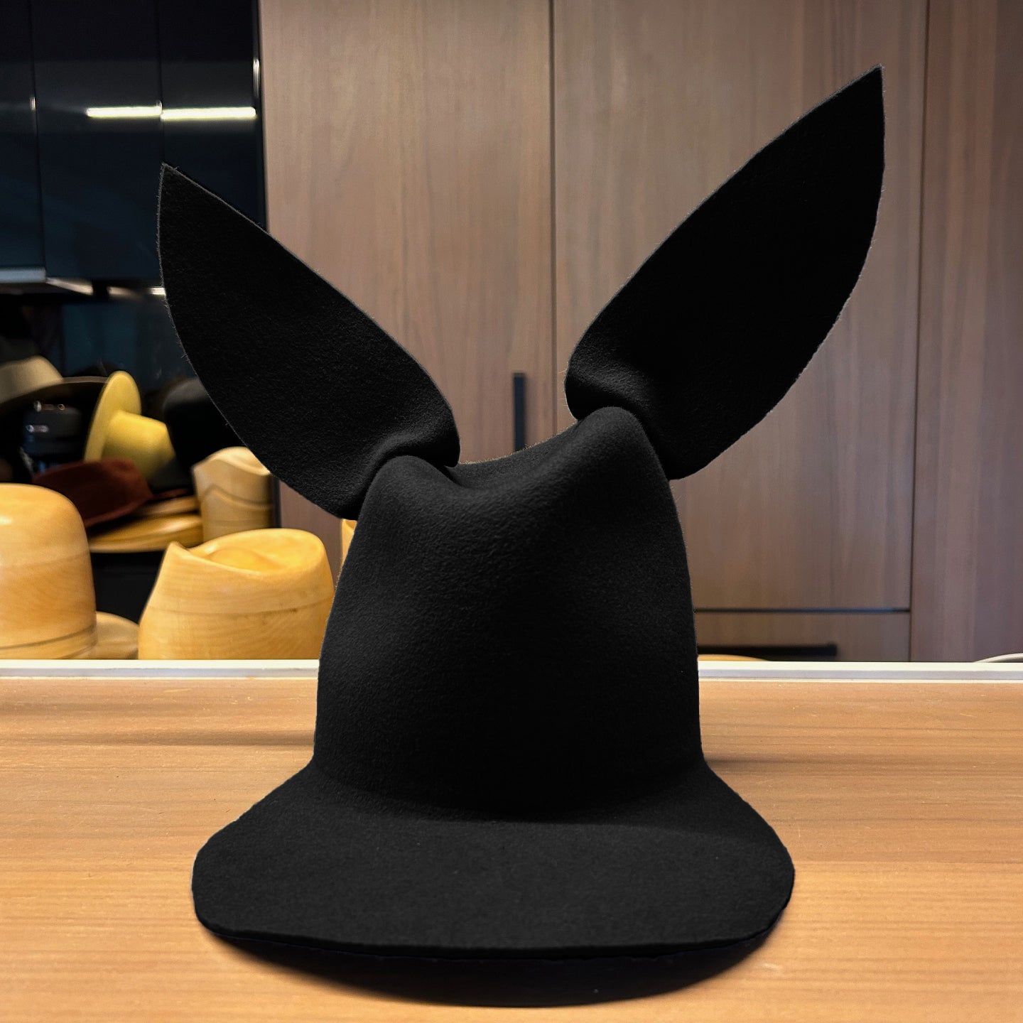 The High/Low Bunny is crafted in western-weight felt, defined by an asymmetrical crown and stiffened signature bunny ears. Playful yet architectural, it applies classic millinery structure to a sculptural silhouette designed to hold its form.